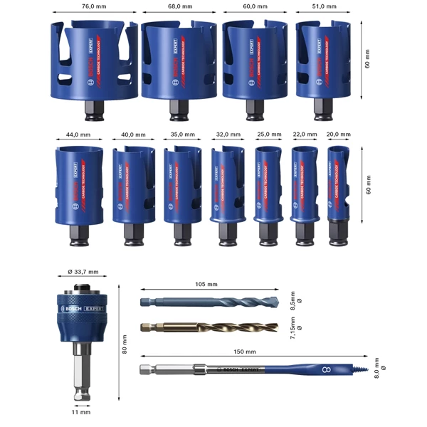 | Conditionnement | Coffret de 15 pièces : 11 scies cloches avec 1 adaptateur, 2 forets à centrer et 1 mèche bois |